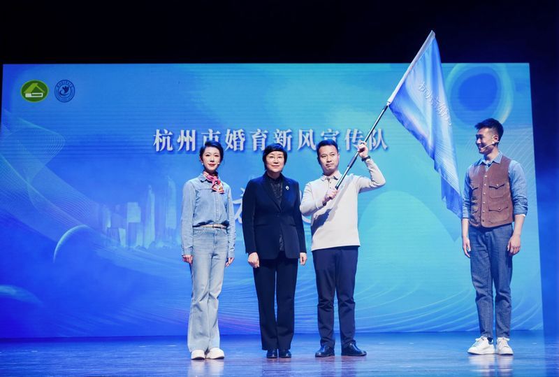 市计生协专职副会长李艳娟为“杭州市婚育新风宣传队”授旗。该队伍由杭州滑稽艺术剧院、杭州杂技总团、杭州新青年歌舞团、大华书场等艺术院团及青年志愿者组成。未来,他们将继续走进校园、深入基层,以艺术化、生活化的方式持续传播婚育新风,为构建生育友好型社会贡献文艺力量。